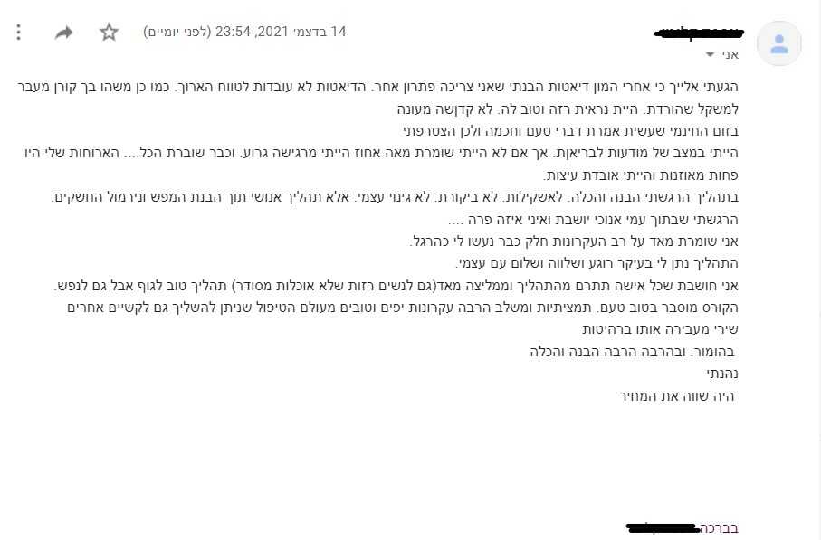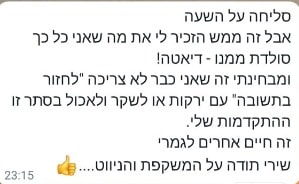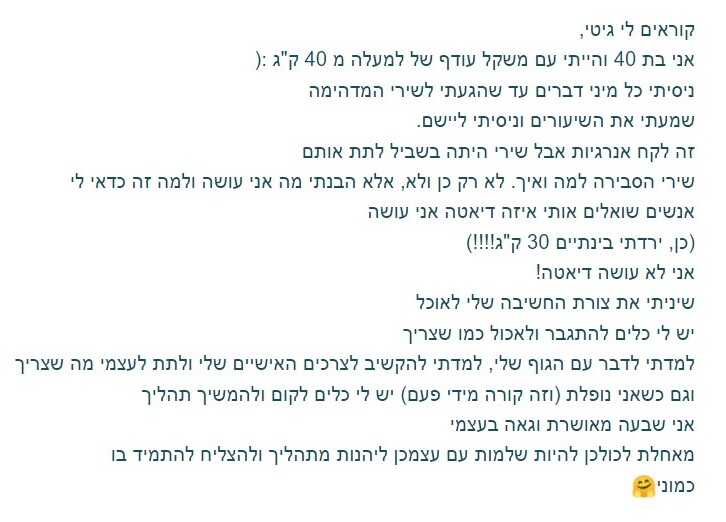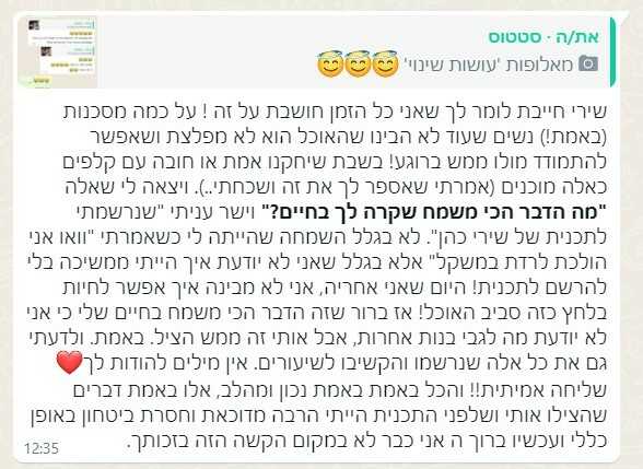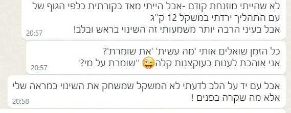 במהלך הדרך שלי גם המשקל שלי התאזן, וירדתי כעשרים קילו, למרות זאת – אני מבהירה ומדגישה בכל הזדמנות, שהתהליכים שלי אינם תהליכי הרזיה או מוכווני ירידה במשקל.