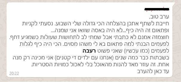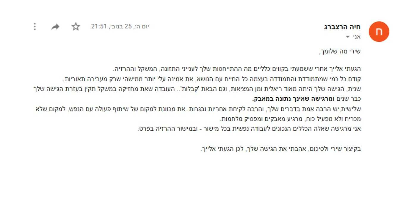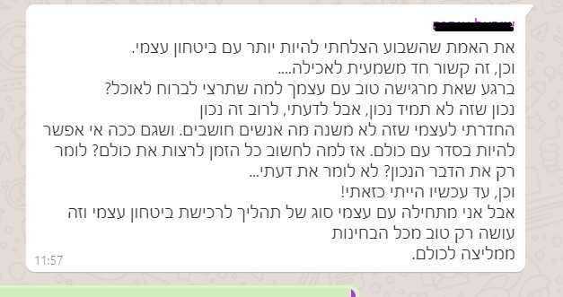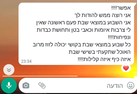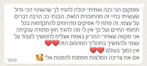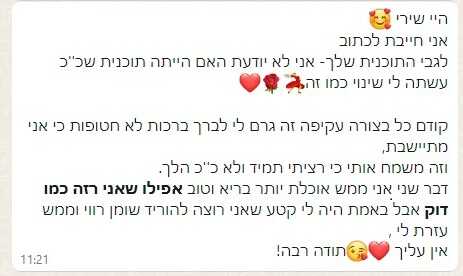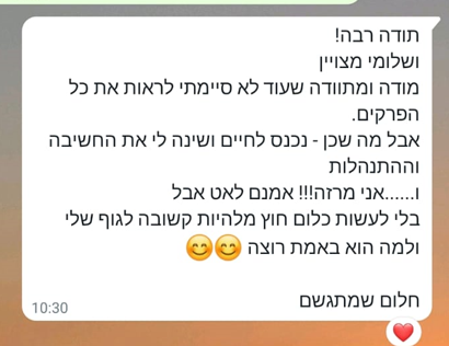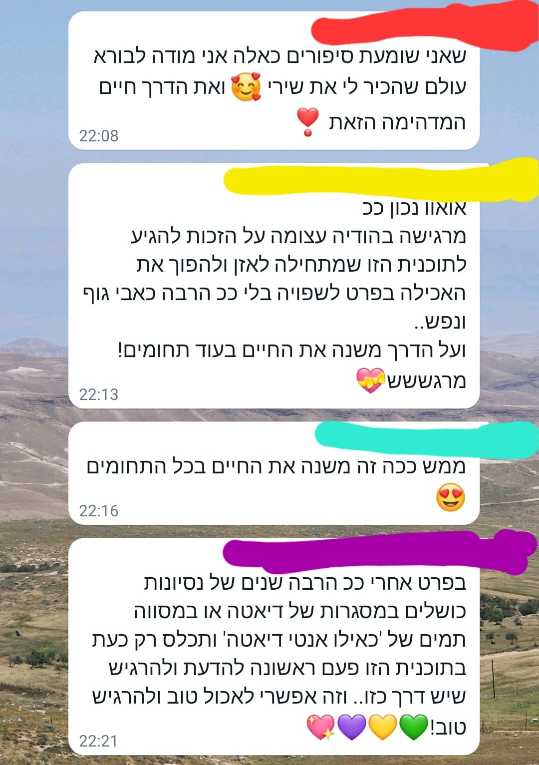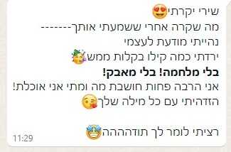 את נכנסת לקבוצה סגורה שקטה (בווצאפ או במייל) לקבלת מסרים מחזקים לאורך השבועות לדיוק התהליך