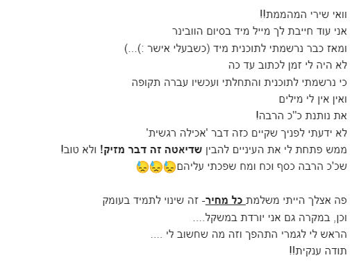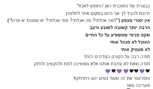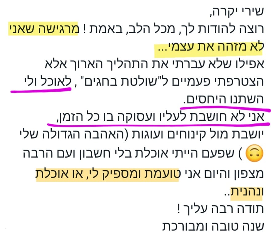 כשפגשתי בעולם איזון האכילה הרגשית, הרגשתי שגיליתי קסם. שיש פה שפה שלמה ומדהימה שמעולם לא הכרתי, ושככל שאני מתאמנת עליה – אני משתחררת מעוד מאבק ומאזנת את הדחפים ללא מלחמה.